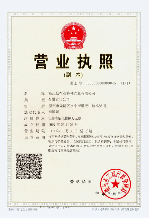 浙江信得達(dá)特種管業(yè)有限公司成立于1997年,占地面積28000平方米,注冊(cè)資金5158萬(wàn)元,是國(guó)家高新技術(shù)企業(yè)、浙江省專精特新企業(yè),有4家控股公司,產(chǎn)品覆蓋了特種無(wú)縫換熱器管、高品質(zhì)不銹鋼管、鍛壓閥門(mén)制造商。