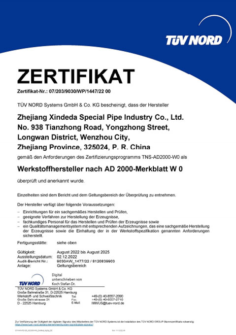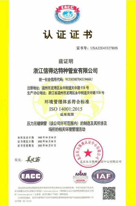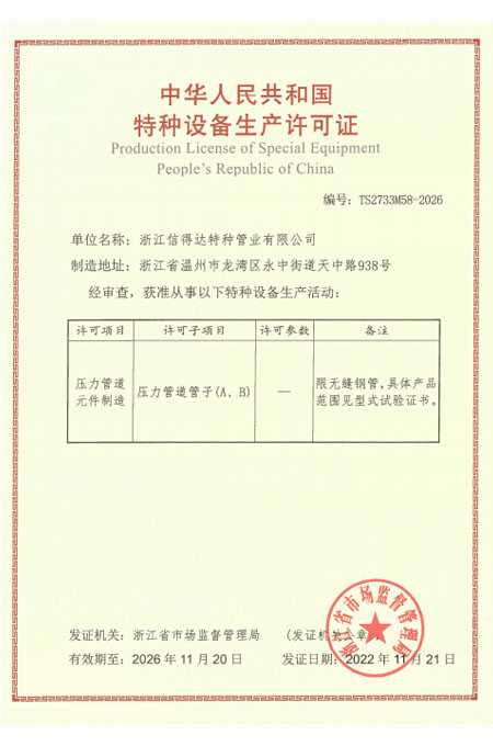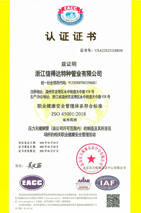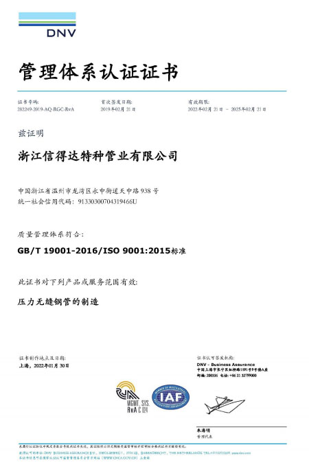 公司已全面通過(guò)了ISO9001:2008質(zhì)量管理體系認(rèn)證、14000環(huán)境管理體系認(rèn)證、18000職業(yè)健康管理體系認(rèn)證、國(guó)家質(zhì)量檢驗(yàn)檢疫總局A2-B類壓力管道元件制造許可、 歐盟PED認(rèn)證及德國(guó)AD-2000產(chǎn)品強(qiáng)制認(rèn)證、美國(guó)ASME材料產(chǎn)品認(rèn)證、信得達(dá)擁有1條穿孔生產(chǎn)線,10條冷拔生產(chǎn)線8條冷軋?zhí)胤N無(wú)縫鋼管生產(chǎn)線。
